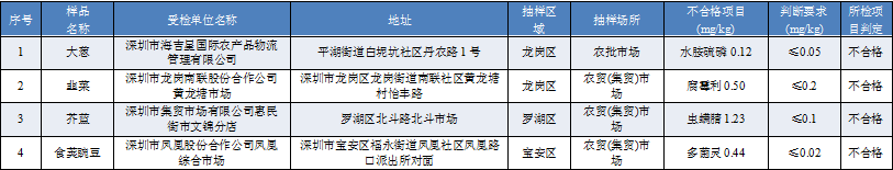 見圳客戶端·深圳新聞網(wǎng)2019年11月12日訊 11月11日,深圳市市場監(jiān)督管理局發(fā)布9月16日-9月20日深圳市農(nóng)產(chǎn)品質(zhì)量安全豬肉和蔬菜例行監(jiān)測結(jié)果。2019年9月16日-9月20日,深圳市市場監(jiān)督管理局在全市監(jiān)測豬肉產(chǎn)品53份,抽檢結(jié)果顯示全部樣品合格。抽檢蔬菜共124份,4份抽樣樣品不合格,都為農(nóng)藥檢測超標。其中,深圳市海吉星國際農(nóng)產(chǎn)品物流管理有限公司銷售的大蔥水胺硫磷超標,深圳市龍崗南聯(lián)股份合作公司黃龍?zhí)潦袌鲣N售的韭菜腐霉利超標,深圳市集貿(mào)市場有限公司惠民街市文錦分店銷售的芥藍蟲螨腈超標,深圳市鳳凰股份合作公司鳳凰綜合市場銷售的食莢豌豆多菌靈超標。