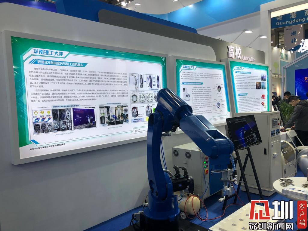 在粵港澳大灣區(qū)展示區(qū)中還有廣東省高校參展。華南理工大學(xué)的輕量化6自由度關(guān)節(jié)型工業(yè)機(jī)器人正在進(jìn)行現(xiàn)場(chǎng)展示。