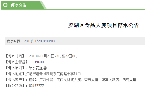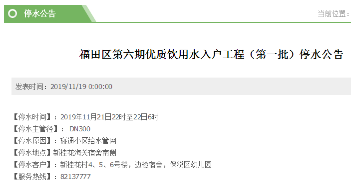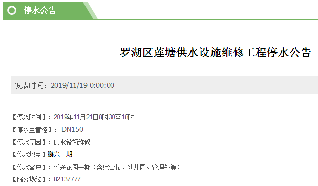 11月21日,福田、南山、羅湖區(qū)均有小區(qū)計劃停水,其中羅湖區(qū)鵬興花園一期從早上8時30分至下午18時停水,其它地方均在晚間。