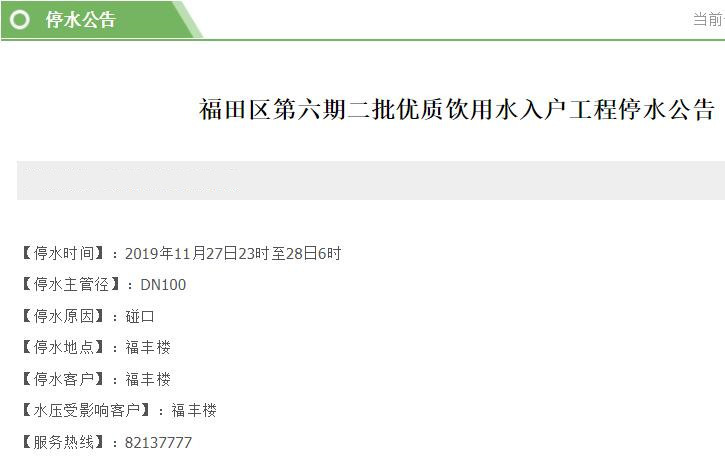 停水時(shí)間:2019年11月26日23時(shí)至27日6時(shí)