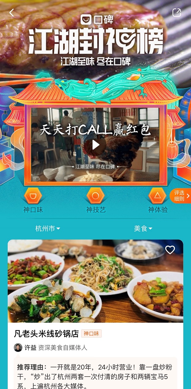 今年“雙12”,口碑餓了么首次發(fā)布“江湖封神榜”,入圍店鋪先由美食體驗者、觀察家、媒體團在內(nèi)的本地評審團先提名,再經(jīng)過阿里本地生活大數(shù)據(jù)進行智能評分,同時邀請眾多消費者投票驗名“真身“。商戶上榜不靠流量,不用刷單,也不必擔心惡意差評影響流量和排名。消費者就算沒有本地老餮帶路,參考“江湖封神榜”就能找到地道美食。目前,首批入選的1730家店鋪,分布在北京、杭州、成都、廣州等13座城市。消費者通過口碑a(chǎn)pp上選擇相應的城市坐標,點擊“江湖封神榜”,就可以找到推薦好店。