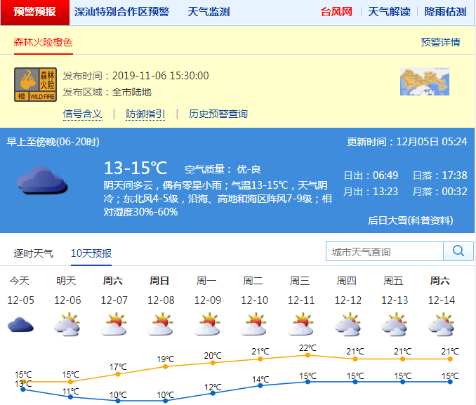 全市森林火險橙色預警信號生效中,其中深汕區(qū)森林火險紅色預警和寒冷黃色預警信號生效中。