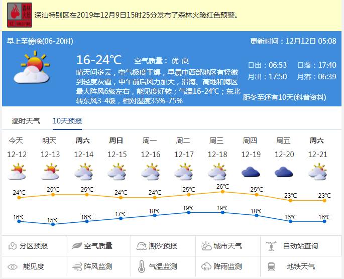 見(jiàn)圳客戶(hù)端·深圳新聞網(wǎng)2019年12月12日訊 12日深圳晴天間多云,空氣極度干燥,早晨中西部地區(qū)有輕微到輕度灰霾,中午前后風(fēng)力加大,沿海、高地和海區(qū)最大陣風(fēng)6級(jí)左右,能見(jiàn)度好轉(zhuǎn);氣溫16-24℃。