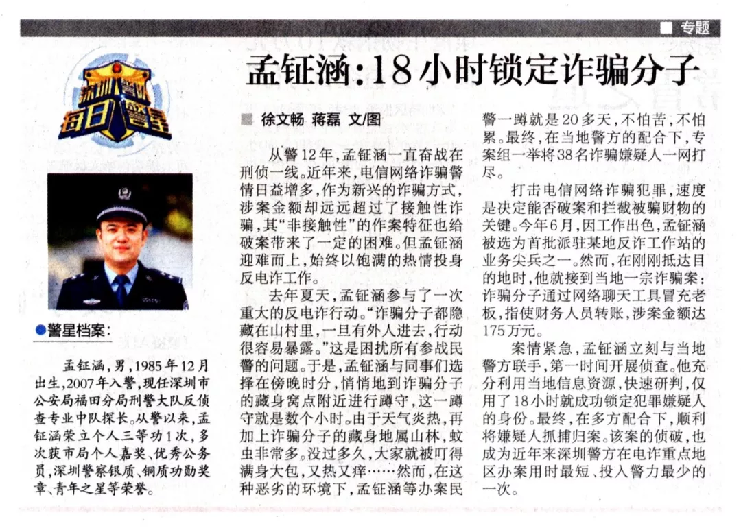 孟鉦涵,男,1985年12月出生,2007年入警,現(xiàn)任深圳市公安局福田分局刑警大隊(duì)反偵查專業(yè)中隊(duì)探長。從警以來,孟鉦涵榮立個人三等功1次,多次獲市局個人嘉獎、優(yōu)秀公務(wù)員,深圳警察銀質(zhì)、銅質(zhì)功勛獎?wù)隆⑶嗄曛堑葮s譽(yù)。