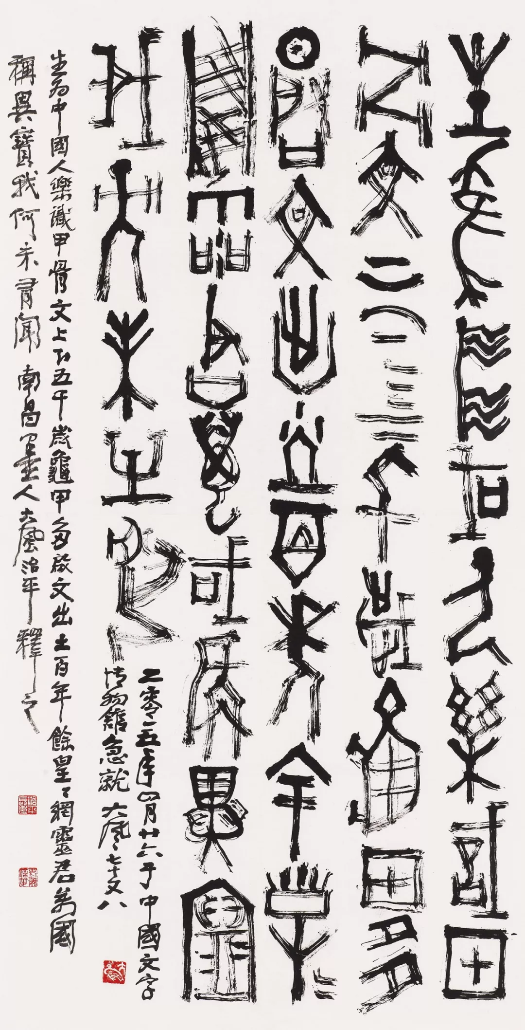 魏治平的甲骨文作品大膽構(gòu)思,探尋先祖造字奧秘。觀其書(shū)法,已經(jīng)不僅僅是寫(xiě),而是用巧妙的結(jié)構(gòu)、對(duì)文字進(jìn)行解構(gòu),形成一個(gè)整體藝術(shù)品。有的字甚至可以根據(jù)其落筆的重點(diǎn)、長(zhǎng)短等,唱出古曲。