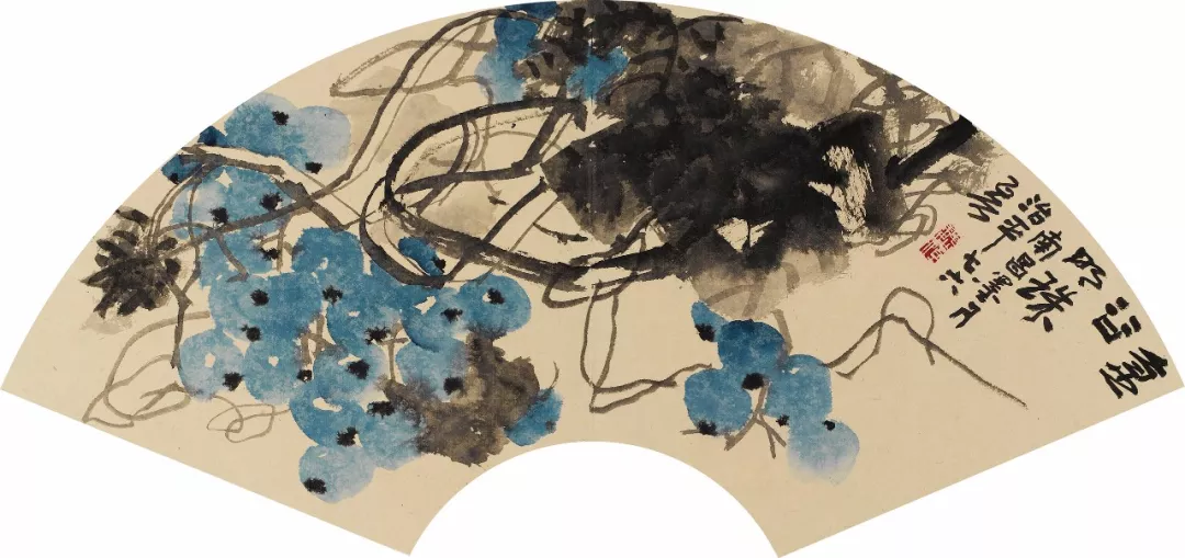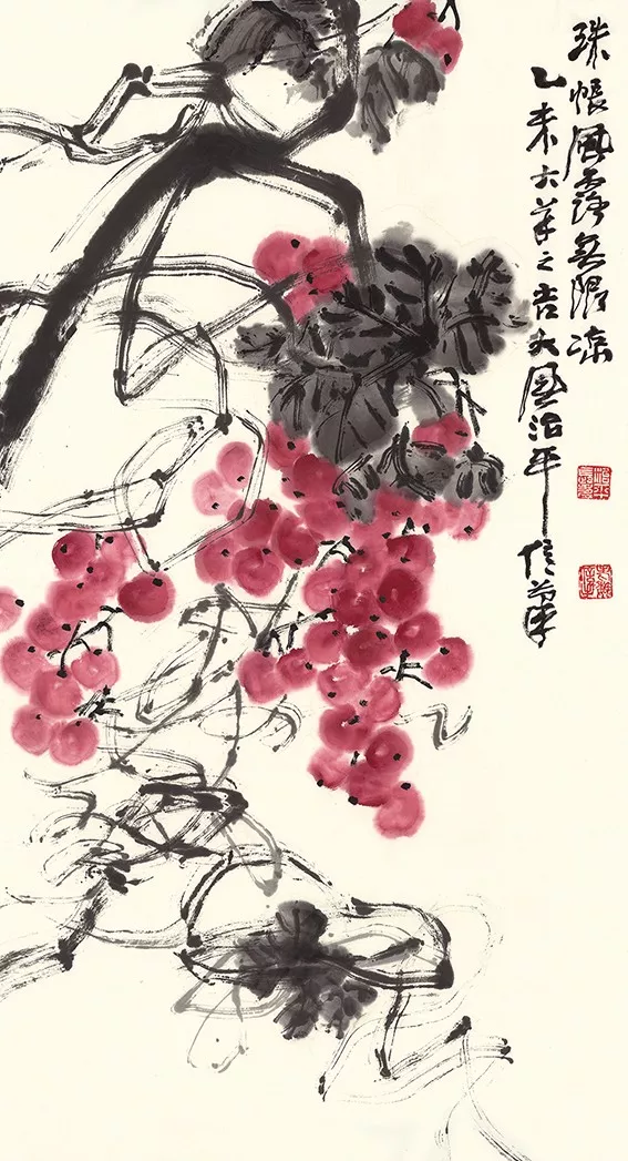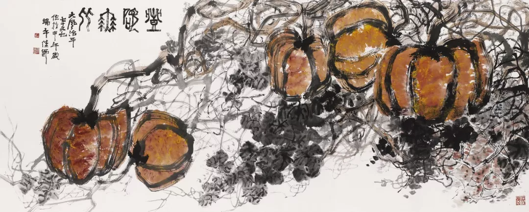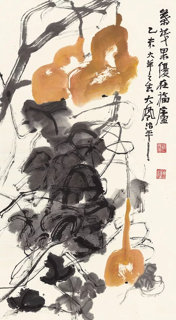 魏治平的畫(huà),尤以藤類(lèi)見(jiàn)長(zhǎng),構(gòu)圖奇異,筆酣墨飽,瓜果菜蔬鳥(niǎo)蟲(chóng)魚(yú),無(wú)一不獨(dú)出心裁,氣象崢嶸,水墨淋漓之間極富創(chuàng)作精神,他筆下的南瓜、紫藤、凌霄、葡萄等更有齊白石、吳昌碩之風(fēng),自成一派,奔放不離法度,神微孕育氣魄。