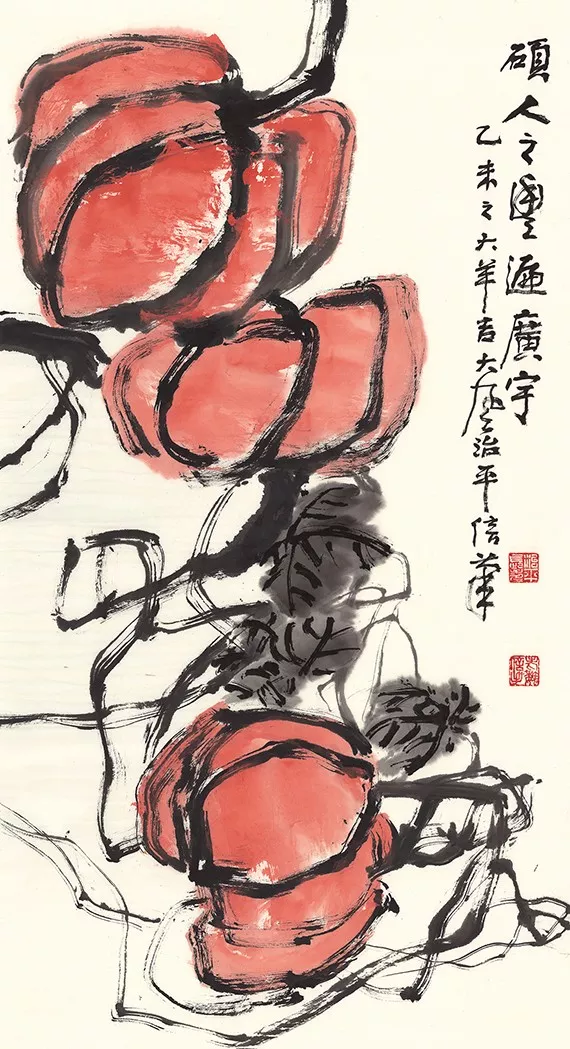 魏治平先生的畫(huà),尤以藤類(lèi)見(jiàn)長(zhǎng),構(gòu)圖奇異,筆酣墨飽;他最為推崇齊白石,繪畫(huà)技法亦師法齊白石、吳昌碩、端木夢(mèng)錫等人,瓜果菜蔬鳥(niǎo)蟲(chóng)魚(yú),無(wú)一不獨(dú)出心裁,氣象崢嶸,水墨淋漓之間極富創(chuàng)作精神,他筆下的南瓜、紫藤、凌霄、葡萄等更有齊白石、吳昌碩之風(fēng),自成一派,奔放不離法度,神微孕育氣魄。