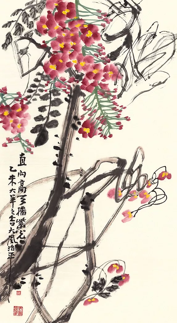 魏治平的藝術(shù)貴于創(chuàng)造,以書(shū)法入畫(huà),畫(huà)中常見(jiàn)有篆書(shū)筆意。三十年前長(zhǎng)江日?qǐng)?bào)總編海洋先生,曾提筆寫(xiě)下《魏瘋子傳奇》,洋洋灑灑八千言,一時(shí)間荊楚大地震動(dòng)。西泠印社理事朱妙根稱其“方寸之間有靈山,紅花墨葉又一派”。西泠印社執(zhí)行社長(zhǎng)、中國(guó)印學(xué)博物館館長(zhǎng)劉江先生為其第一本書(shū)畫(huà)作品集題簽書(shū)名。美國(guó)前總統(tǒng)老布什收有魏老書(shū)法作品“龍蛇競(jìng)走舞長(zhǎng)空、點(diǎn)染梅花分外紅。且賦新詩(shī)遙寄意,長(zhǎng)江密水兩相通”。印第安納州州立大學(xué)博物館大廳懸掛的便是魏老八尺紅梅詩(shī)書(shū)畫(huà)中堂。