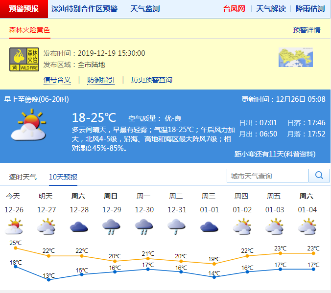 見圳客戶端·深圳新聞網(wǎng)2019年12月26日訊 今日白天多云,氣溫18-25℃,明天傍晚至27日受冷空氣影響,北風(fēng)加大,沿海、高地和海區(qū)最大陣風(fēng)7級左右,氣溫下降4-5℃,天氣轉(zhuǎn)涼。28日多云,29-30日有一次明顯降雨過程。