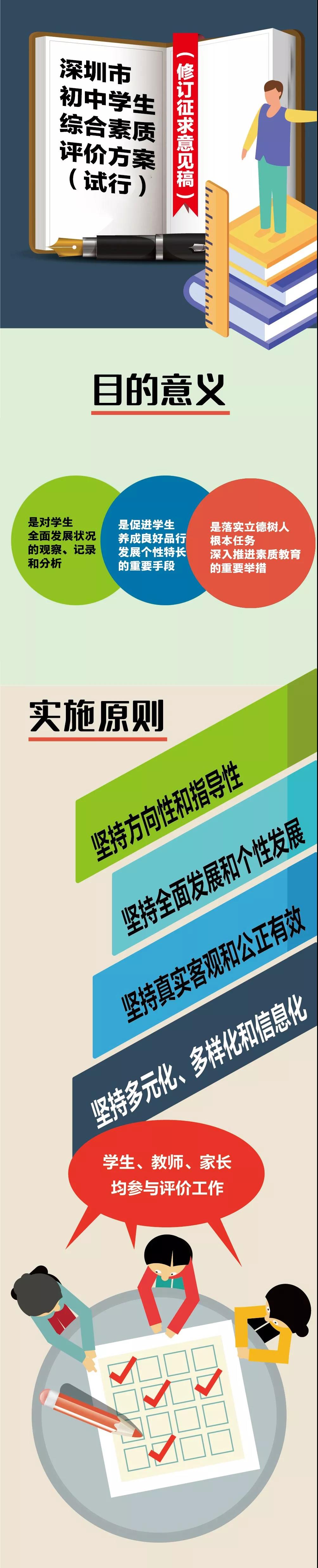 為深入貫徹中共中央、國務院《關于深化教育教學改革全面提高義務教育質量的意見》和《教育部關于進一步推進高中階段學校考試招生制度改革的指導意見》(教基二〔2016〕4號)、《廣東省教育廳關于實施初中學生綜合素質評價的指導意見(試行)》(粵教基[2018]10號)等文件精神,落實立德樹人根本任務,“五育并舉”,促進學生的全面發(fā)展和個性發(fā)展,根據(jù)工作需要,深圳市教育局于2019年12月11日啟動了《深圳市初中學生綜合素質評價方案(試行)》的修訂工作。在大量調研論證、多方征求意見的基礎上,形成了《深圳市初中學生綜合素質評價方案(試行)(修訂征求意見稿)》。