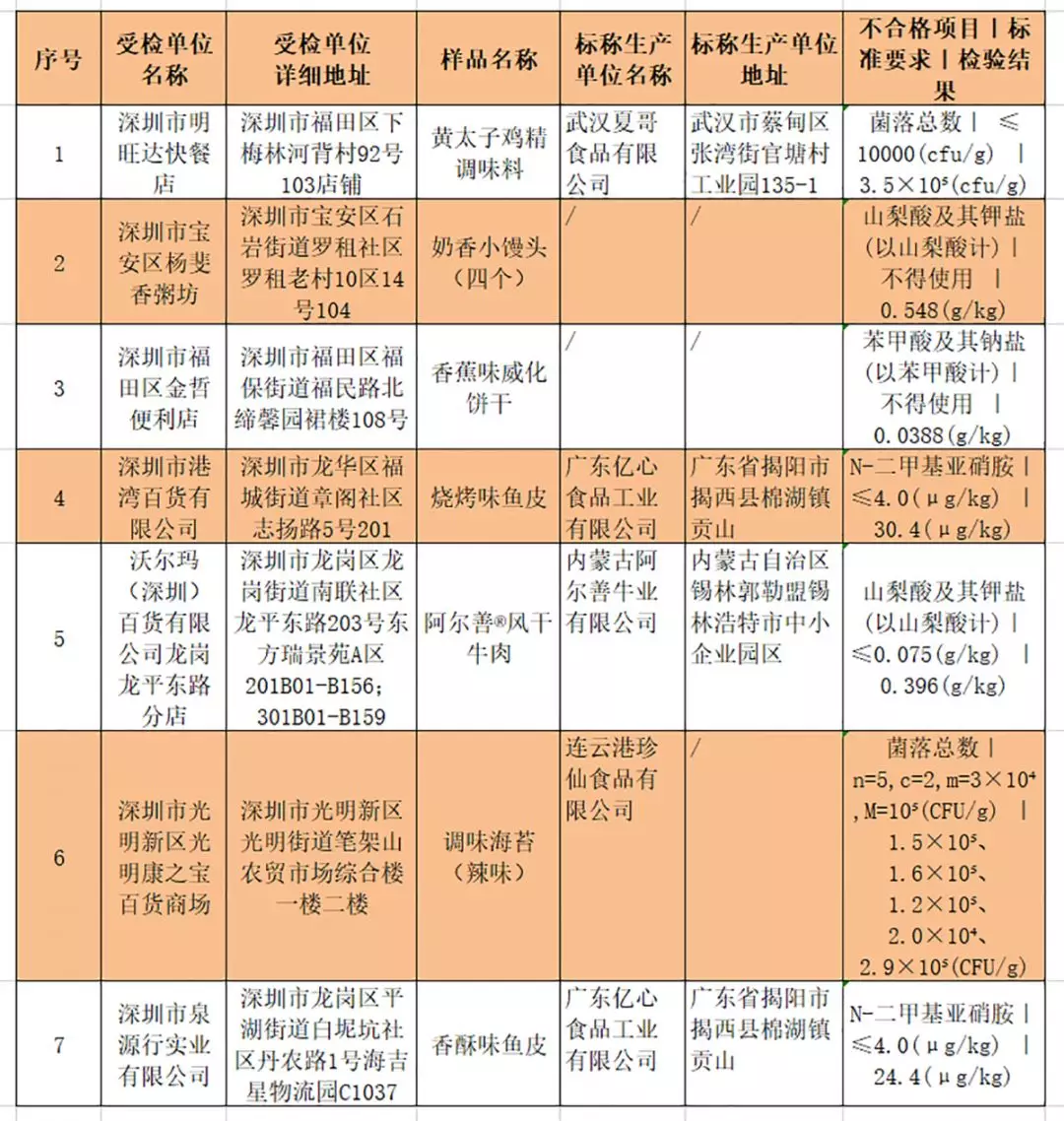 本次共抽檢流通、餐飲環(huán)節(jié)食品844批次,涉及流通、餐飲環(huán)節(jié)經(jīng)營主體256家次,共檢測食品指標(biāo)6187項(xiàng)次。其中檢出不合格樣品7批次,涉及不合格食品類別有餅干1批次,餐飲食品1批次,肉制品1批次,水產(chǎn)制品3批次,調(diào)味品1批次;涉及不合格項(xiàng)目類別為微生物污染、食品添加劑、其他污染物。