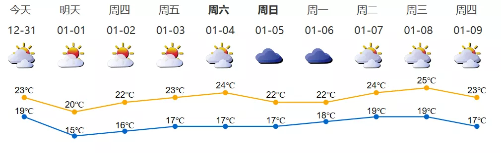 12月31日-1月1日,受冷空氣影響,氣溫下降,1日早晨最低氣溫15℃左右,沿海、高地和海區(qū)最大陣風(fēng)7級(jí)左右,2日多云間晴天,氣溫回升。