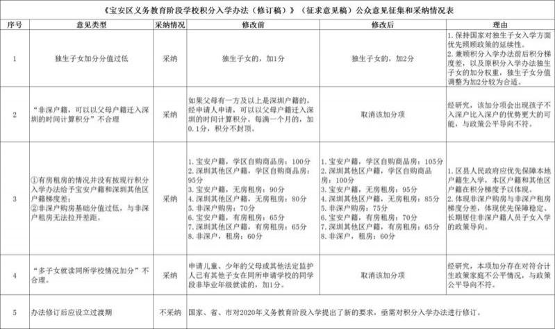 晶報(bào)2020年01月06日訊 獨(dú)生子女加分?jǐn)M由1分調(diào)整至2分,多子女就讀同所學(xué)校加分取消。日前,《寶安區(qū)義務(wù)教育階段學(xué)校積分入學(xué)辦法(修訂稿)》(征求意見(jiàn)稿)經(jīng)論證修改后再度公示。去年12月,寶安區(qū)教育局發(fā)布相關(guān)公告,擬對(duì)積分入學(xué)錄取方式和積分方式進(jìn)行修訂,其中,"獨(dú)生子女加分從90分調(diào)整至1分"引發(fā)廣泛關(guān)注。在新修訂稿中,寶安區(qū)教育局結(jié)合市民意見(jiàn)反饋,擬將獨(dú)生子女加分由1分調(diào)整至2分,并取消兩項(xiàng)加分項(xiàng),同時(shí)對(duì)部分情況分值進(jìn)行調(diào)整,以體現(xiàn)積分梯度。