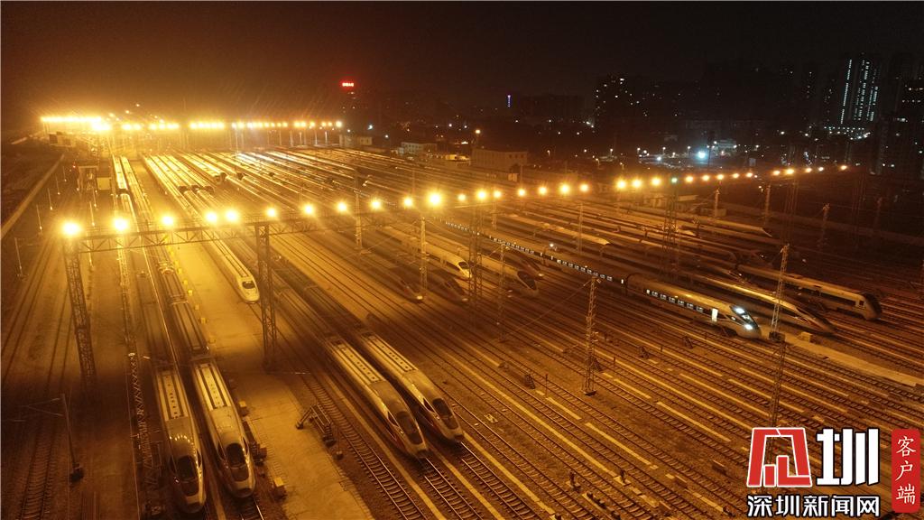 1月15日凌晨,深圳動車運(yùn)用所內(nèi)的高鐵列車。