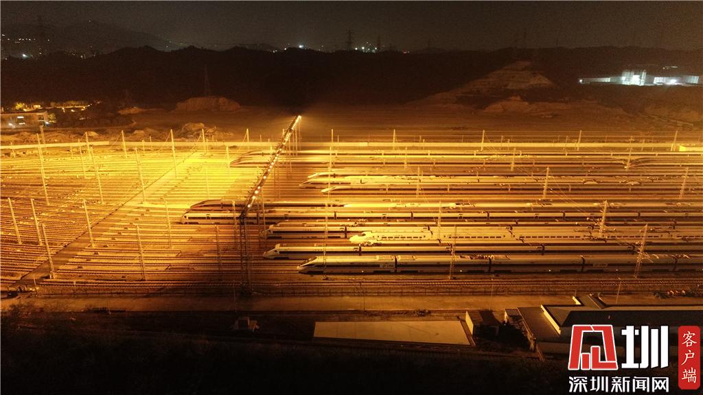 1月15日凌晨,深圳動車運(yùn)用所內(nèi)的存車庫航拍畫面。