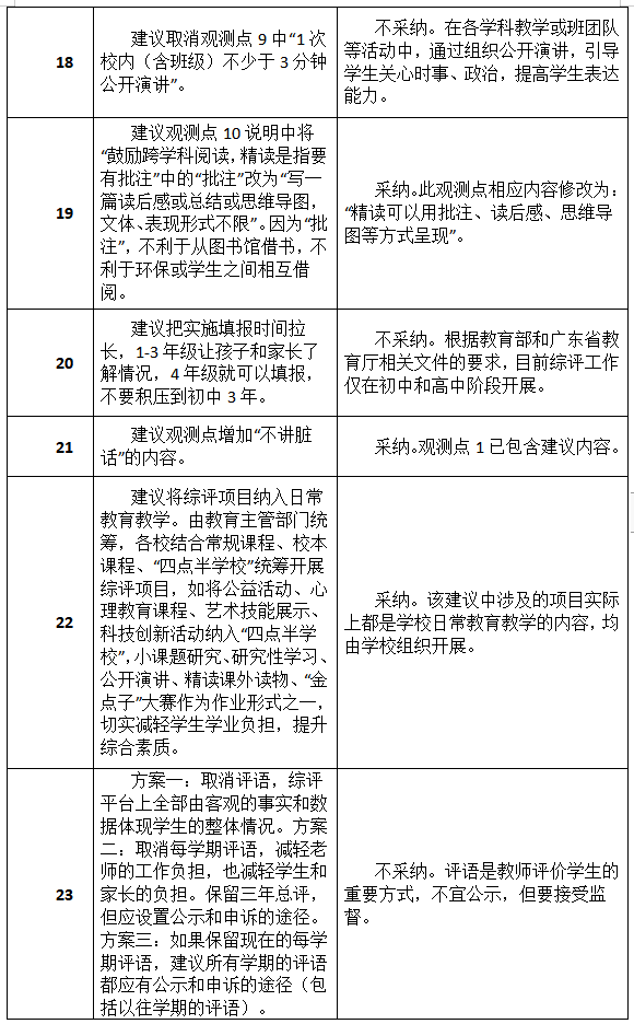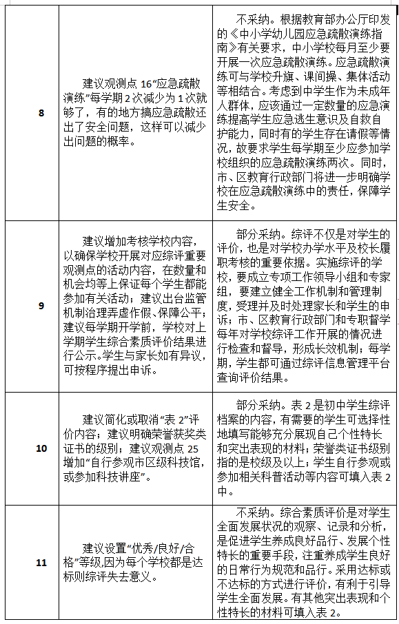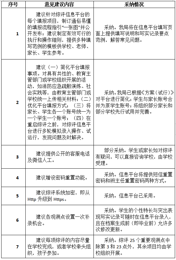 市教育局通報(bào)指出,在意見征集期間,該局共收到304個郵件及2個信件。市教育局對上述建議進(jìn)行了統(tǒng)一的分類,這些建議被分成了34類,并組織了專家學(xué)者進(jìn)行了認(rèn)真研究。其中,有關(guān)平臺簡化、允許修改更新、建立綜評宣導(dǎo)隊(duì)伍等14類建議被采納,另有5類建議被部分采納,余下15類建議沒有被采納。