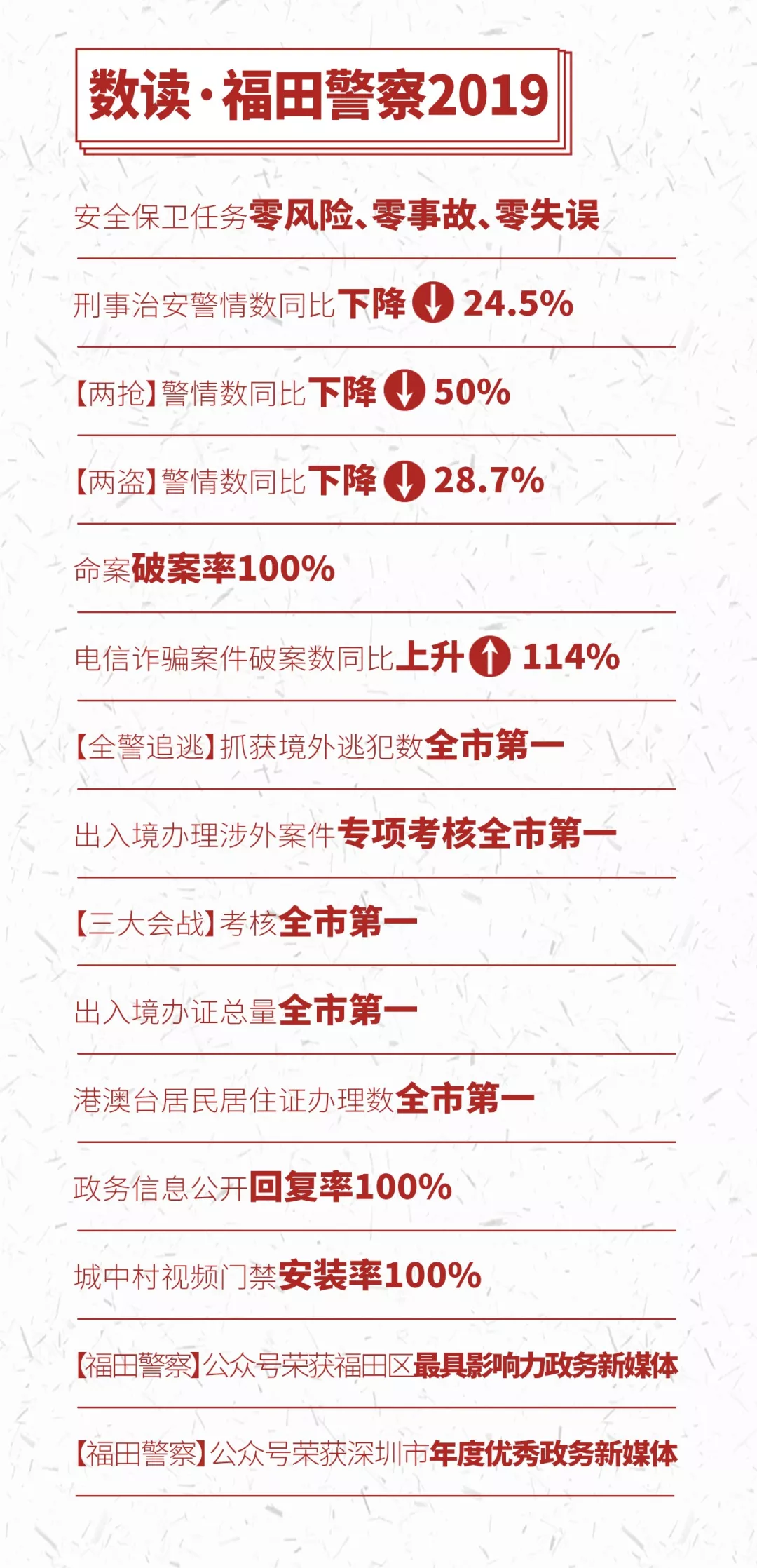 剛剛過去的2019年,是福田公安勇?lián)姑?,砥礪奮進(jìn)的一年,在市局黨委和區(qū)委區(qū)政府的堅(jiān)強(qiáng)領(lǐng)導(dǎo)下,福田公安穩(wěn)中求進(jìn)、攻堅(jiān)克難,穩(wěn)妥應(yīng)對(duì)化解系列重大風(fēng)險(xiǎn),有效護(hù)航中心城區(qū)社會(huì)政治穩(wěn)定,打贏新中國成立70周年大慶安保和澳門回歸20周年慶典安保攻堅(jiān)戰(zhàn),各項(xiàng)重大安保活動(dòng)“零風(fēng)險(xiǎn)、零事故、零失誤”;強(qiáng)力推進(jìn)掃黑除惡、“颶風(fēng)2019”等一系列專項(xiàng)行動(dòng),合成打擊效能突顯;持續(xù)推動(dòng)現(xiàn)代化警務(wù)機(jī)制變革,改革攻堅(jiān)蹄疾步穩(wěn);提升社會(huì)治安基礎(chǔ)治理工作,治安面貌持續(xù)向好;隊(duì)伍建設(shè)舉措剛?cè)嵯酀?jì),錘煉“四個(gè)鐵一般”的過硬警隊(duì)。