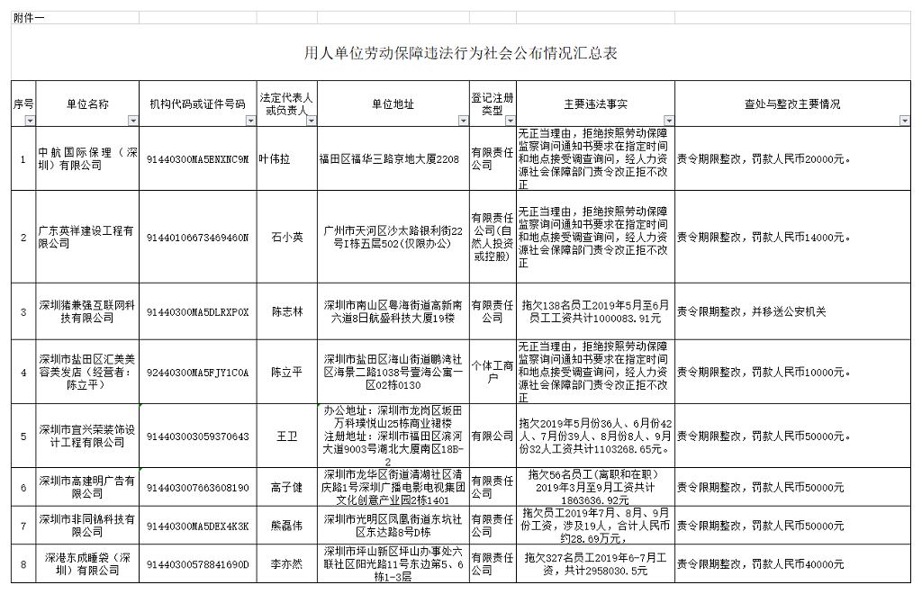 2019年第四季度,深圳市人力資源部門繼續(xù)加大對欠薪等勞動保障違法行為的打擊力度,依法處罰,對涉嫌犯罪的堅決移送司法機(jī)關(guān),切實(shí)維護(hù)勞動者的合法權(quán)益。為加強(qiáng)對違法用人單位的社會監(jiān)督,強(qiáng)化誠信體系建設(shè),加大威懾力,深圳市人力資源和社會保障局依據(jù)《廣東省用人單位重大勞動保障違法行為社會公布暫行規(guī)定》和《深圳市勞動保障違法信息公布辦法》,日前部分區(qū)(新區(qū))人力資源部門查處的一批勞動保障違法案件予以公布。