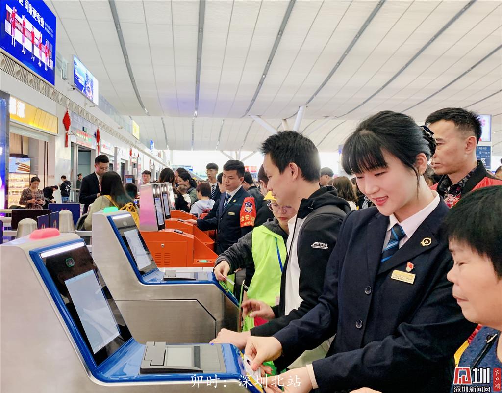 卯時:早晨6點50分左右,深圳北站候車大廳內(nèi),車站工作人員羅瑜欣幫助乘客檢票。