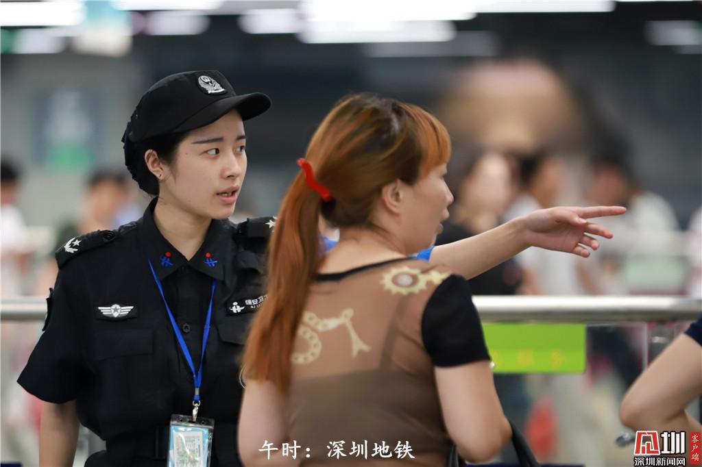 午時:12點56分,深圳地鐵安檢人員謝幗英為乘客指路。