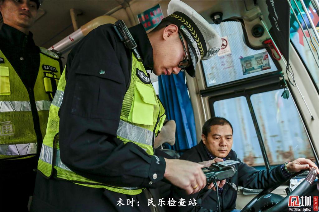未時:下午14時50分左右,一名深圳交警民警對一輛營運客車司機進行檢查。