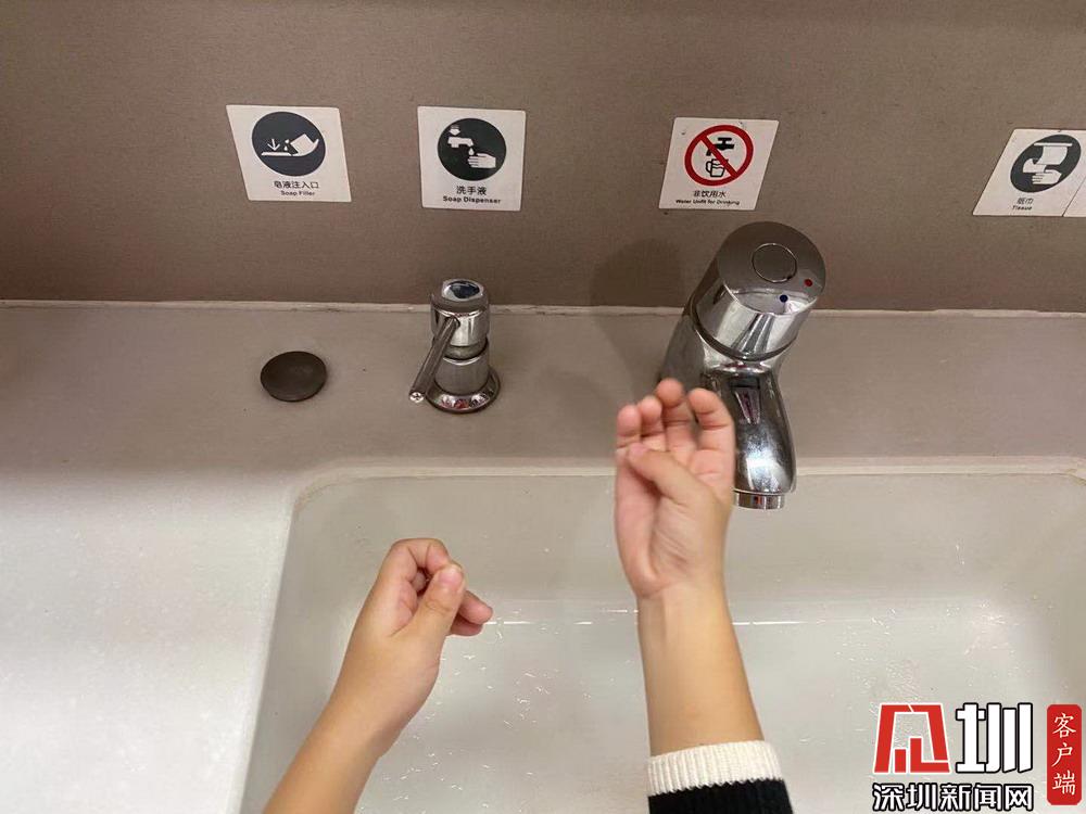 我好像聽見我的肚子開始叫了,媽媽讓我先洗手才能吃東西。洗手池這里有洗手液和一次性擦手紙,水都是溫的,洗手的時(shí)候很舒服。見圳客戶端、深圳新聞網(wǎng)記者 劉婷 攝