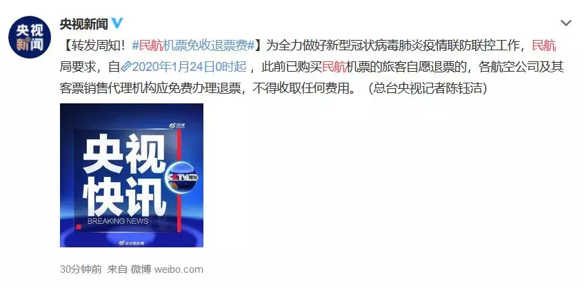 為全力做好新型冠狀病毒肺炎疫情聯(lián)防聯(lián)控工作,民航局要求,自2020年1月24日0時(shí)起,此前已購(gòu)買民航機(jī)票的旅客自愿退票的,各航空公司及其客票銷售代理機(jī)構(gòu)應(yīng)免費(fèi)辦理退票,不得收取任何費(fèi)用。