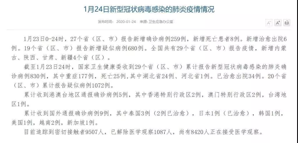 截至1月23日24時(shí),國(guó)家衛(wèi)生健康委收到29個(gè)省(區(qū)、市)累計(jì)報(bào)告新型冠狀病毒感染的肺炎確診病例830例,其中重癥177例,死亡25例,其中湖北省24例、河北省1例。已治愈出院34例。20個(gè)省(區(qū)、市)累計(jì)報(bào)告疑似病例1072例。
