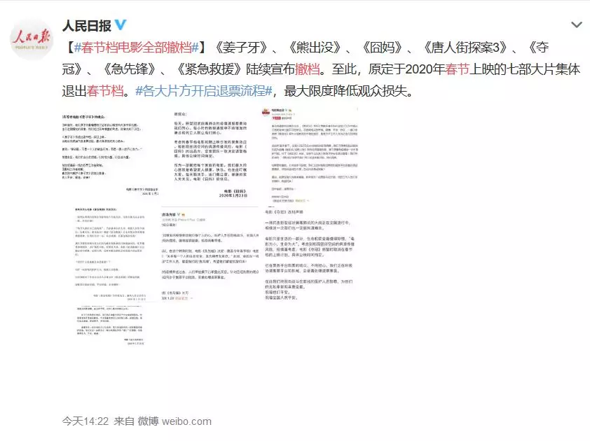 因“擔(dān)憂疫情進(jìn)一步擴(kuò)散”、“考慮影院密閉空間的病源傳播風(fēng)險(xiǎn)”等因素,23日,2020春節(jié)檔的七部影片《唐人街探案3》《囧媽》《奪冠》《緊急救援》《姜子牙》《熊出沒(méi)·狂野大陸》《急先鋒》集體宣布撤檔,均將擇日再映。各大片方開啟退票流程,最大限度降低觀眾損失。