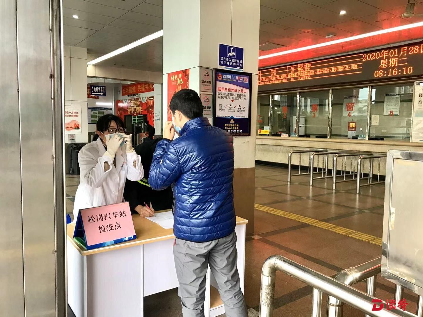 醫(yī)護(hù)人員在松崗汽車(chē)站檢疫點(diǎn)教市民正確佩戴口罩