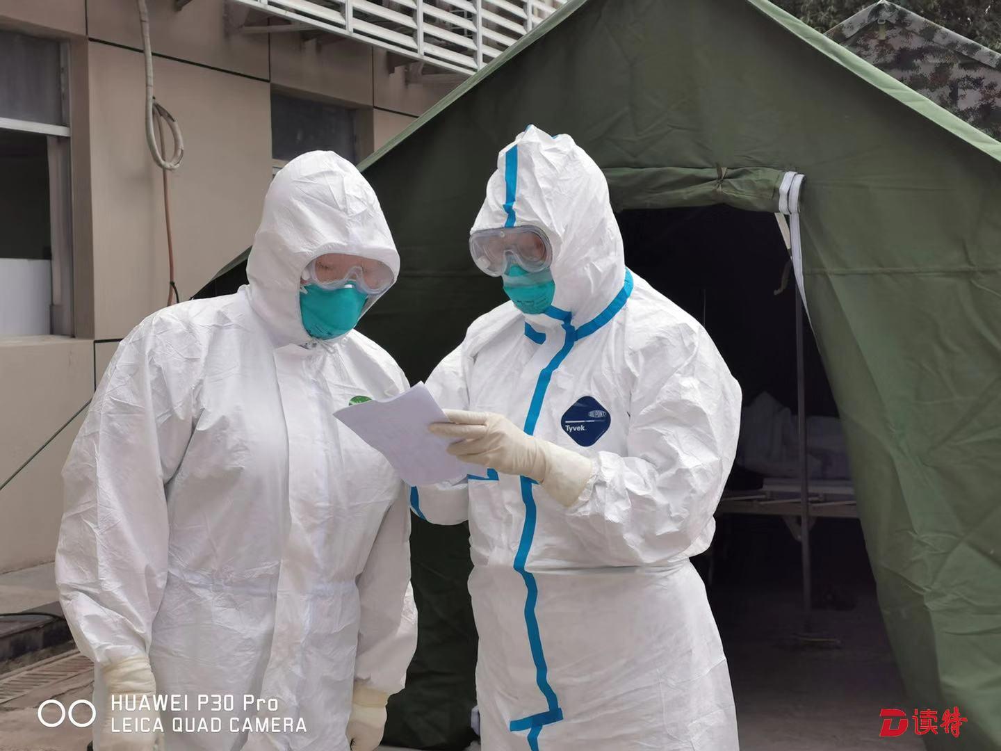 發(fā)熱門(mén)診護(hù)士在隔離觀(guān)察區(qū)進(jìn)行病情交接
