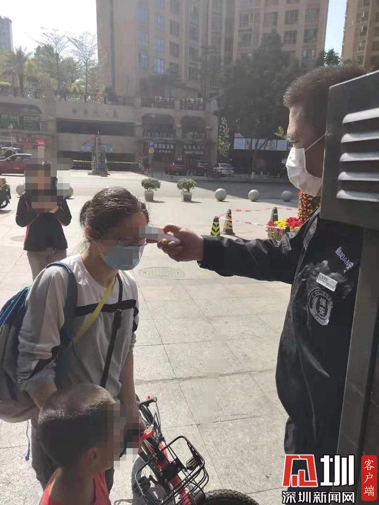 保安對(duì)進(jìn)出住戶(hù)進(jìn)行體溫測(cè)量。