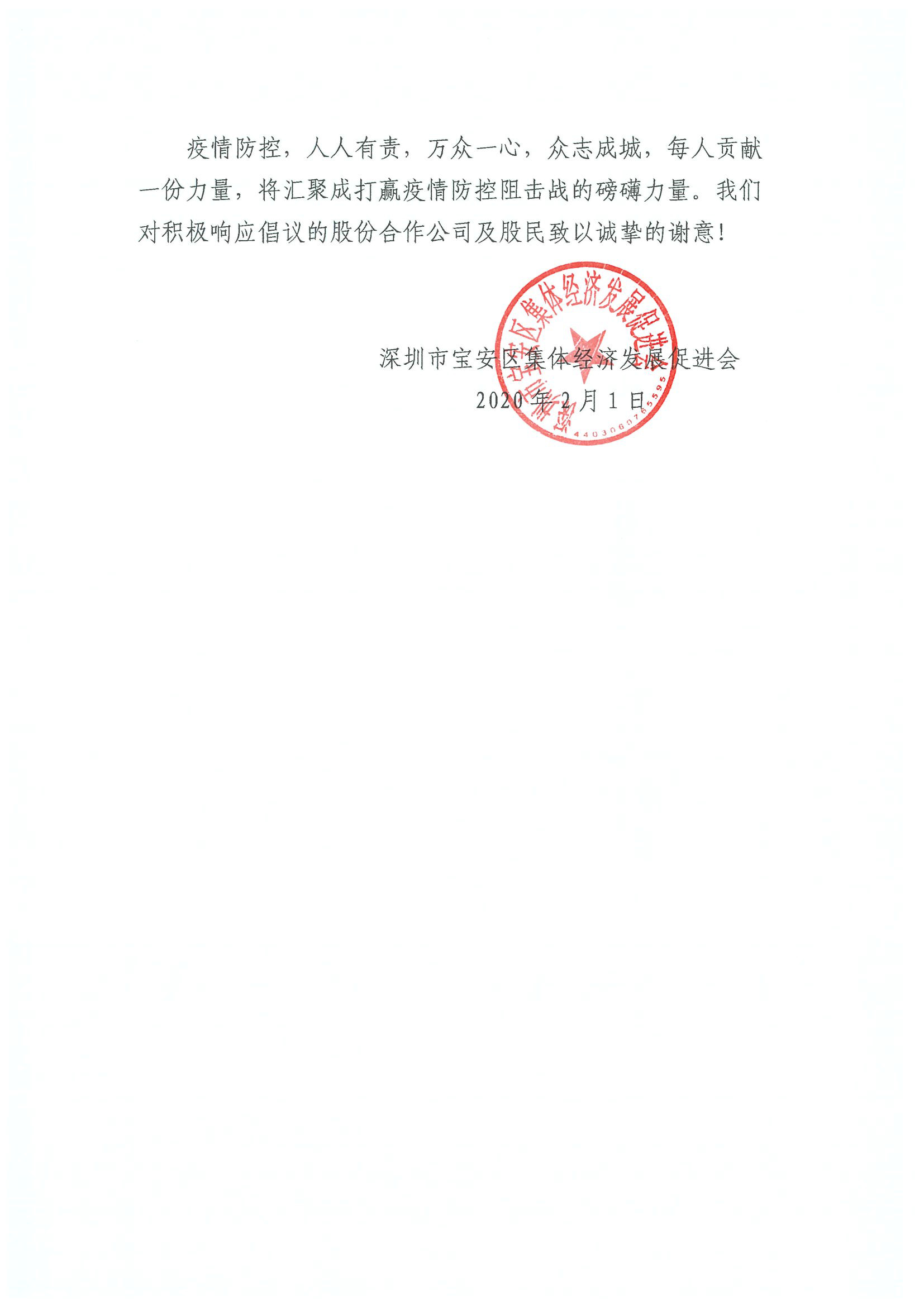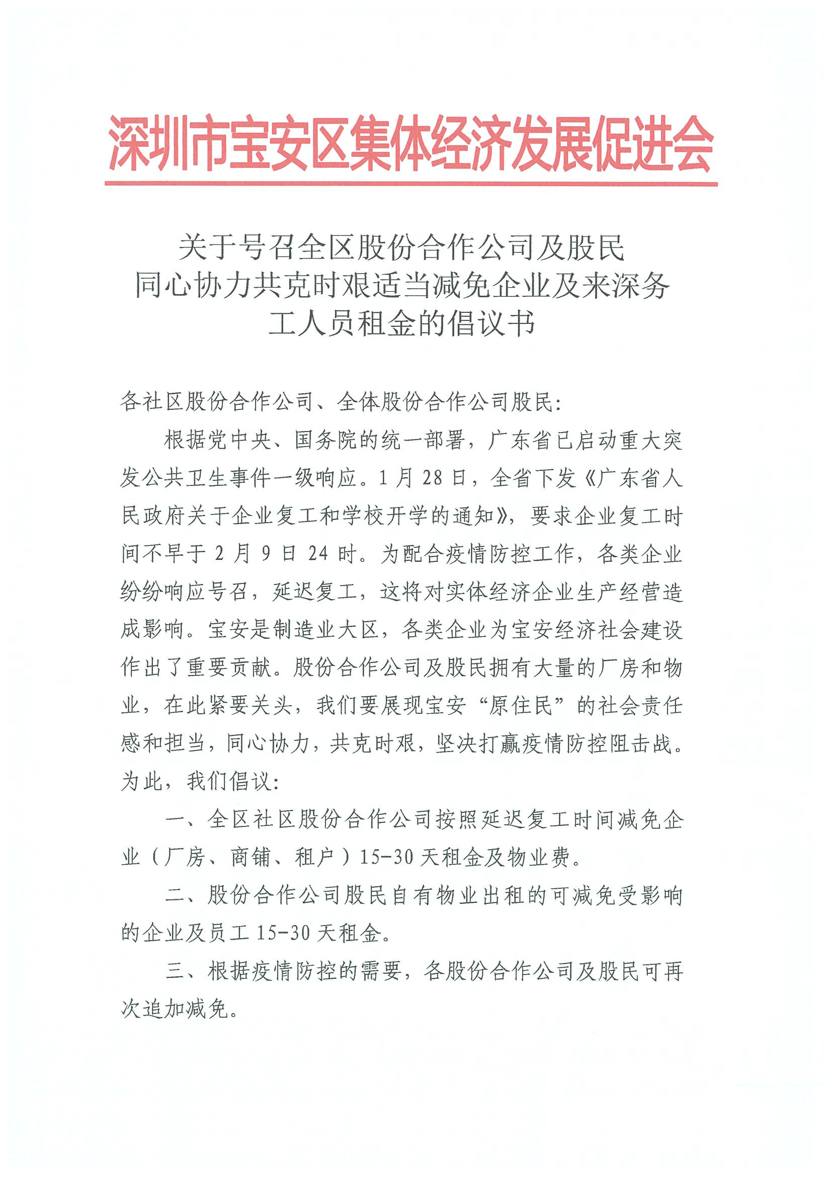 深圳新聞網(wǎng)寶安訊 “疫情防控,人人有責(zé),萬(wàn)眾一心,眾志成城,每人貢獻(xiàn)一份力量,將匯聚成打贏疫情防控阻擊戰(zhàn)的磅礴力量?!?月1日晚,寶安區(qū)集體資產(chǎn)管理局指導(dǎo)寶安區(qū)集體經(jīng)濟(jì)發(fā)展促進(jìn)會(huì)向?qū)毎矃^(qū)各社區(qū)股份合作公司、全體股份合作公司股民發(fā)出《同心協(xié)力共克時(shí)艱適當(dāng)減免企業(yè)及來(lái)深務(wù)工人員租金的倡議書》,號(hào)召全區(qū)股份合作公司及股民適當(dāng)減免企業(yè)及來(lái)深務(wù)工人員15-30天租金及物業(yè)費(fèi),并根據(jù)疫情防控的需要可再次追加減免。