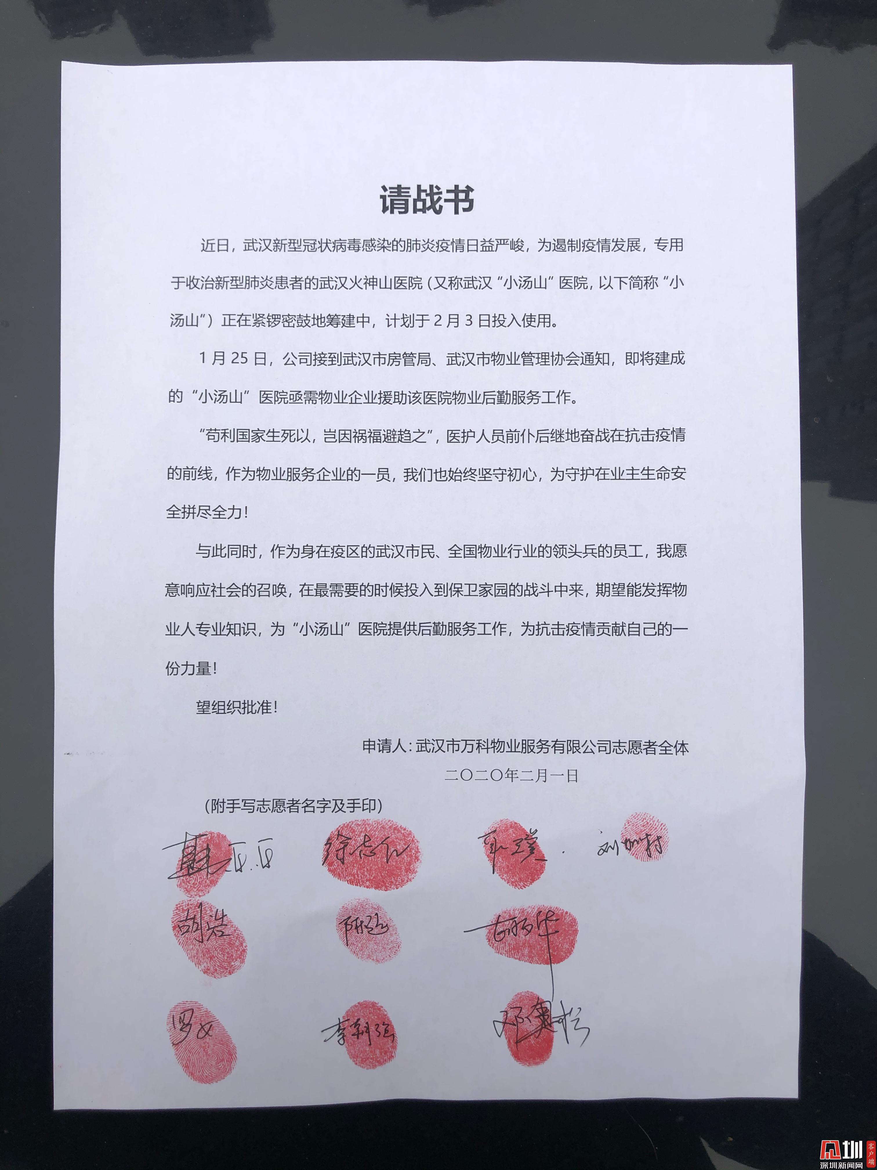 深圳新聞網(wǎng)訊(見圳客戶端、深圳新聞網(wǎng)記者 王志明)2月1日下午,萬科物業(yè)支援武漢火神山醫(yī)院的首批10名志愿者在蔡甸區(qū)中核酒店集合,他們即將踏上前往火神山醫(yī)院的接駁車,連夜開展火神山醫(yī)院的保潔開荒工作,以保障火神山醫(yī)院在2月2日晚上交付投用,2月3日正式收治病人。