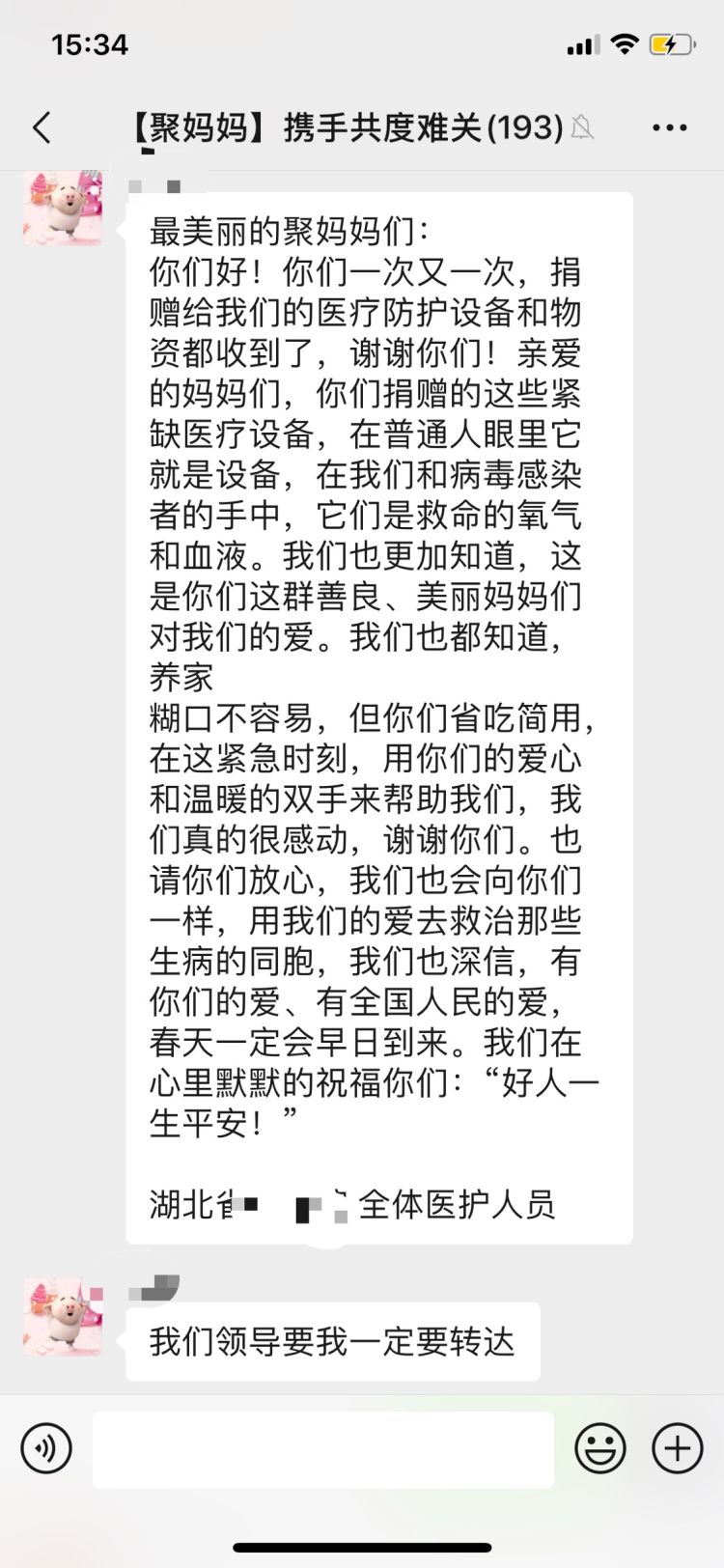 這一百多名媽媽是一個名為“聚媽媽攜手共渡難關(guān)”(以下簡稱“聚媽媽”)微信群的成員,Miya是“聚媽媽”的發(fā)起人之一。1月24日除夕那天,Miya與一位朋友聊起疫情,兩人都覺得,醫(yī)院缺物資,一兩人的力量又太單薄,不如發(fā)動朋友們一起購買直接送到醫(yī)院。Miya在當(dāng)晚9點左右建了這個臨時群,并邀請周圍熟識的朋友加入。