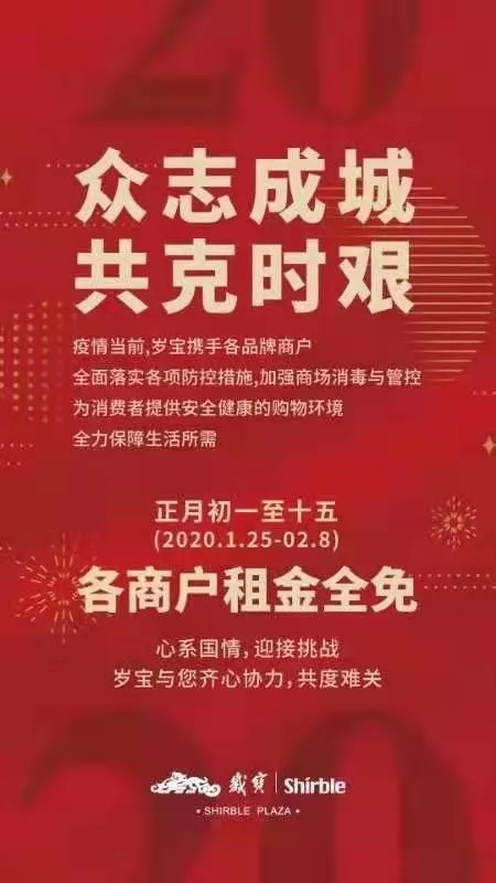 華潤置地宣布免收1月25日—2月9日全國所有商業(yè)項目的租金,與商戶攜手共進。