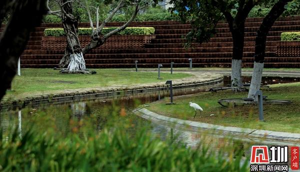 海濱廣場(chǎng):白鷺棲息在略顯空曠的草地上。