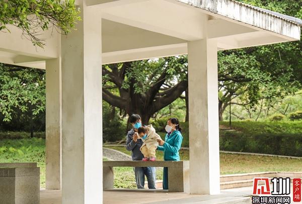 靈芝公園:一對(duì)夫妻戴著口罩來(lái)公園遛娃。