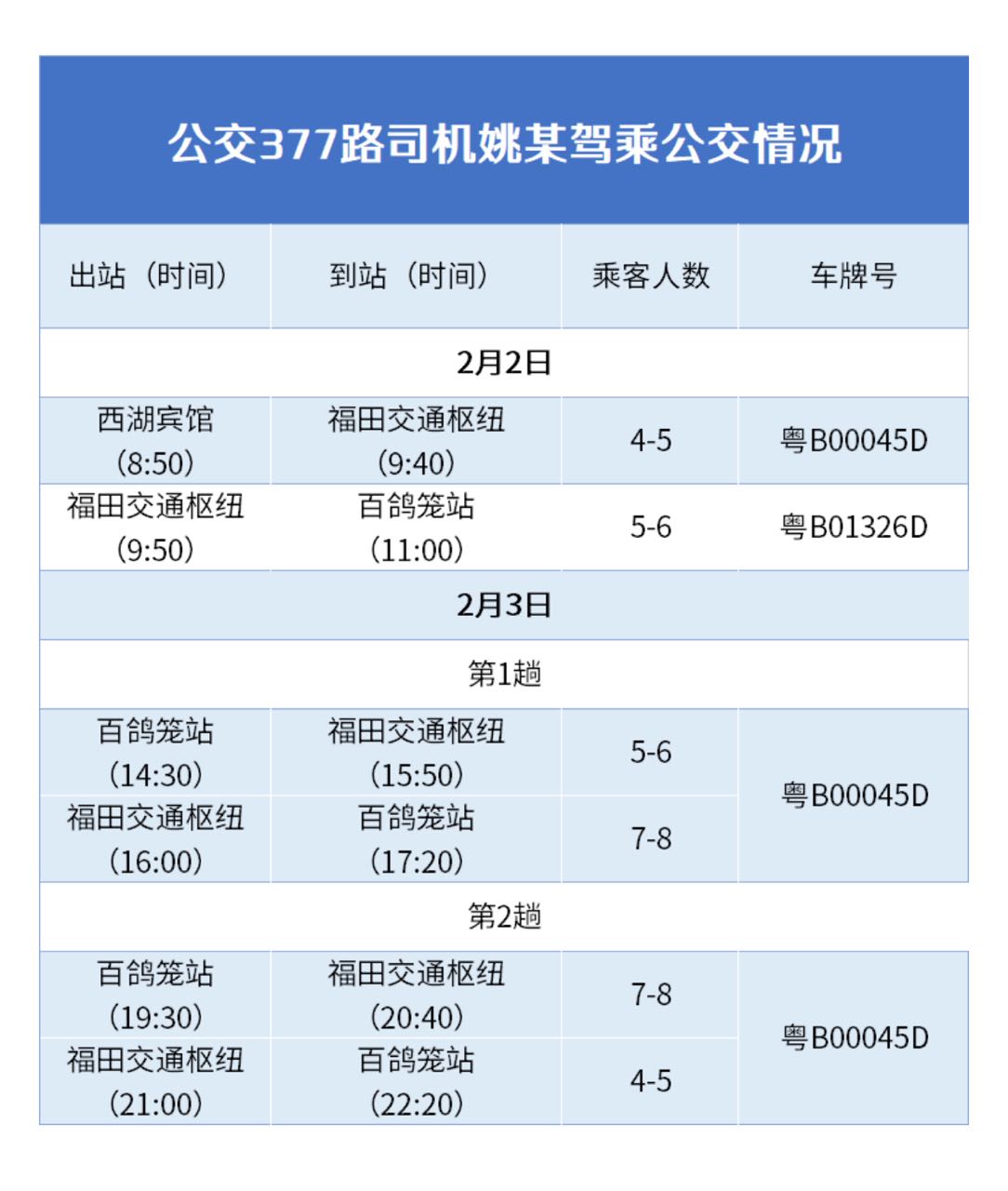 根據(jù)姚某的行車記錄,2月2日早上8時50分,他隨377路跟班一趟,從西湖賓館站至福田交通樞紐,又從該站換車至百鴿籠站,每一輛公交車的乘客人數(shù)為4-6人。跟班時,姚某多數(shù)時間坐在公交車中后部,并佩戴口罩。