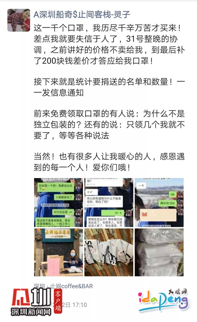 口罩作為最重要的防護(hù)物資之一,在這場(chǎng)疫情防控戰(zhàn)打響后需求量迅速增加,市面上的口罩供不應(yīng)求。大鵬新區(qū)女性創(chuàng)客示范民宿止間客棧老板黃靈芝在這樣的困局中仍想出份力,于是輾轉(zhuǎn)聯(lián)系上了在尼泊爾的朋友,從1月29日到31日,連續(xù)3天反復(fù)溝通協(xié)調(diào),終于買到了1000個(gè)口罩,免費(fèi)贈(zèng)送給市民以解燃眉之急。過程千辛萬(wàn)苦,結(jié)果暖人暖心,她在朋友圈寫到:感恩遇到的每一個(gè)人。