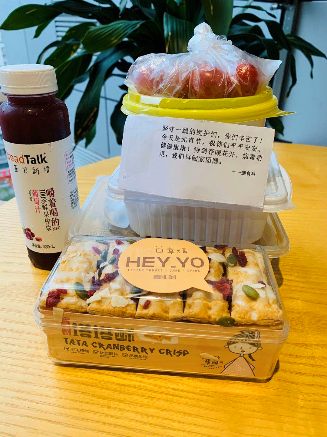 當(dāng)天中午和晚上,發(fā)熱門診、感染科、隔離病房、檢驗(yàn)科等一線的醫(yī)護(hù)人員,除了收到可口的飯菜外,還收到了一碗熱氣騰騰的湯圓。讓他們意外的是,湯圓盒上還貼了溫馨的字條,“堅(jiān)守一線的醫(yī)護(hù)們,你們辛苦了!今天是元宵節(jié),祝你們平平安安、健健康康!待到春暖花開,疫情消退,我們再闔家團(tuán)圓。”