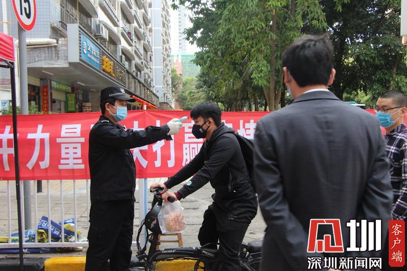 福田梅山苑保安正為一名進(jìn)入小區(qū)的住戶測量體溫。