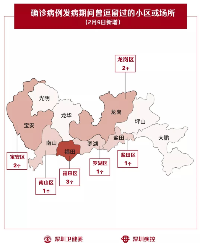 2月9日,疾控專業(yè)人員通過最新的流行病學(xué)調(diào)查確認(rèn),深圳新增10個(gè)小區(qū)(場所),有新確診的病人在出現(xiàn)病征期間曾經(jīng)逗留。