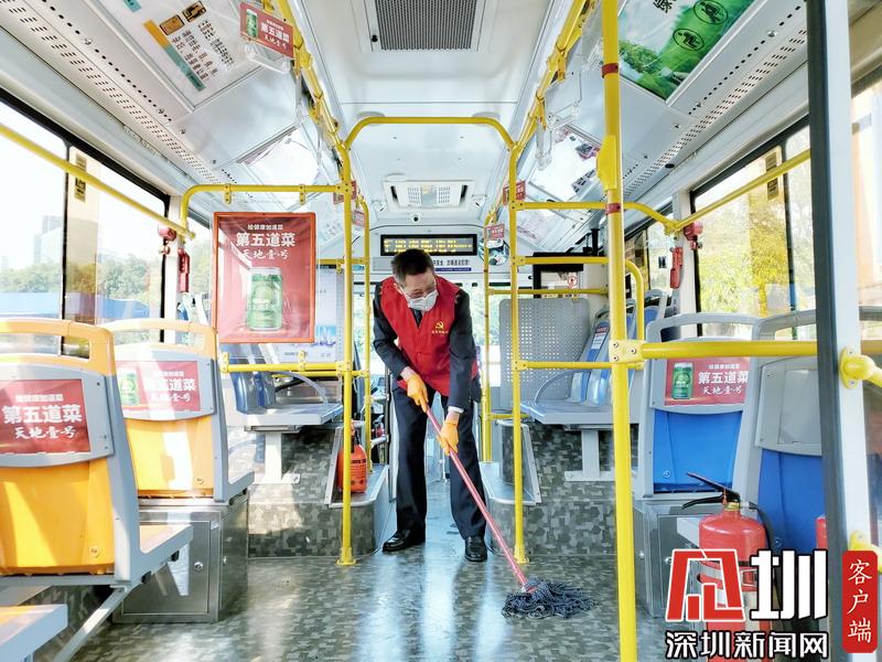 深圳巴士集團(tuán)四分公司工作人員對公交車進(jìn)行消毒擦洗。