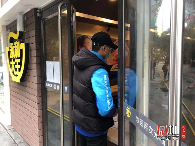 “店內(nèi)員工都是留深人員為主,每個(gè)班次都會(huì)測兩次體溫,要求員工佩戴口罩并手部消毒后才能上崗?,F(xiàn)場消毒清潔時(shí)具備有專門的消毒粉,會(huì)每4小時(shí)進(jìn)行一次清潔消毒。”永和大王工作人員向記者介紹道?,F(xiàn)場門口處陸續(xù)有外賣小哥過來店前領(lǐng)取外賣,記者看到,外賣人員前來領(lǐng)取外賣前都要配合店家進(jìn)行體溫測量,外賣餐盒都以獨(dú)立餐盒包裝的方式給到外賣小哥手上,以保證食物衛(wèi)生安全干凈。