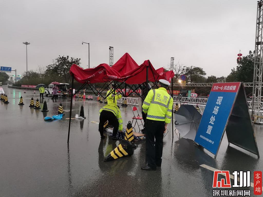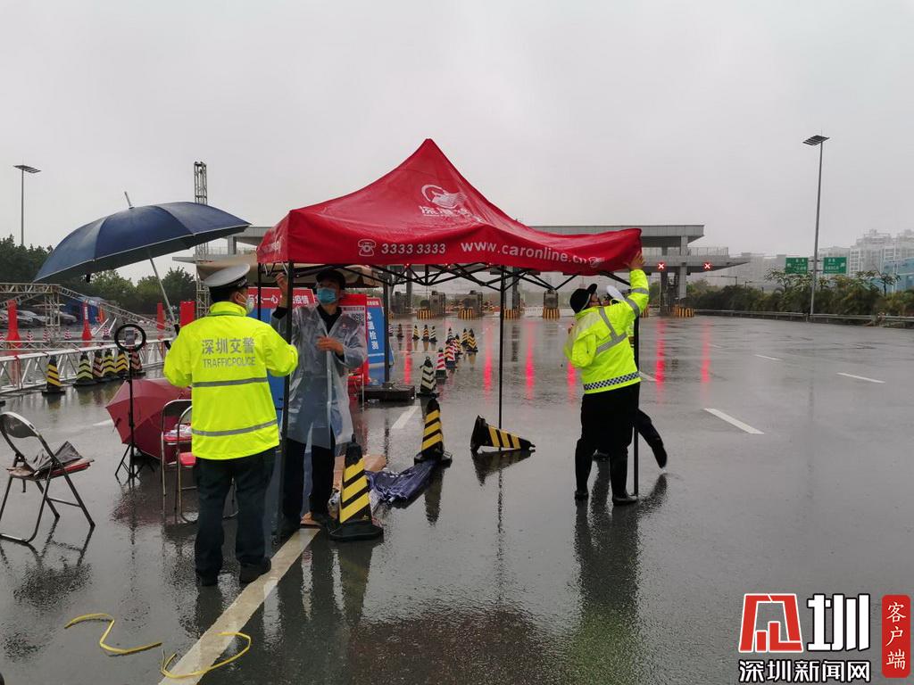 暴雨來(lái)臨,深圳交警民警在檢疫點(diǎn)安裝雨棚。