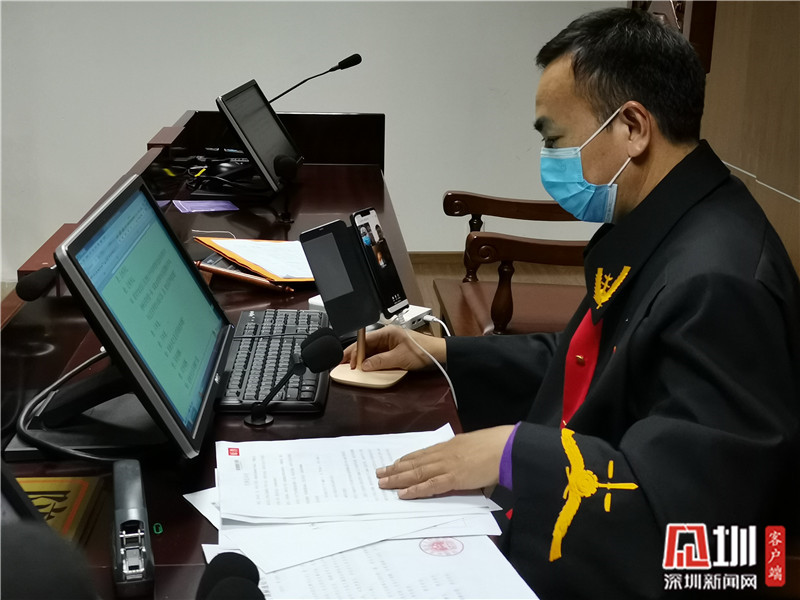 2月13日晚上8點,龍崗法院橫崗法庭第二審判庭庭長張國輝在運用掌上法庭審理一宗農民工追討欠薪的勞務糾紛案件。