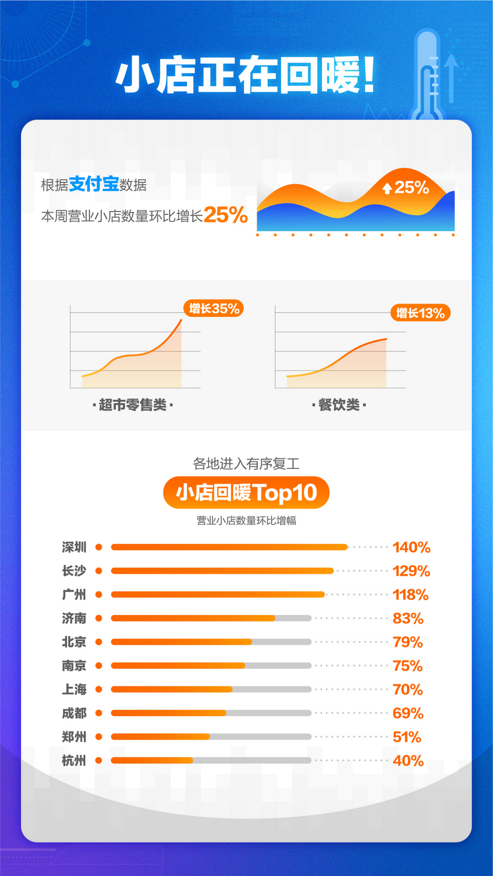 支付寶方面表示,將聯(lián)合各方合作伙伴,通過(guò)貸款、保險(xiǎn)、外賣、在線進(jìn)貨等多種手段,全力支撐小店回暖。