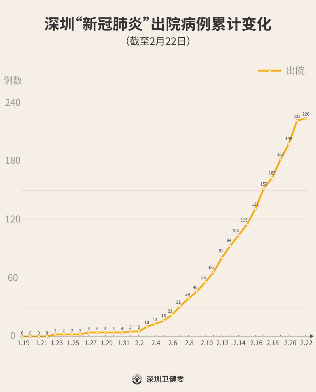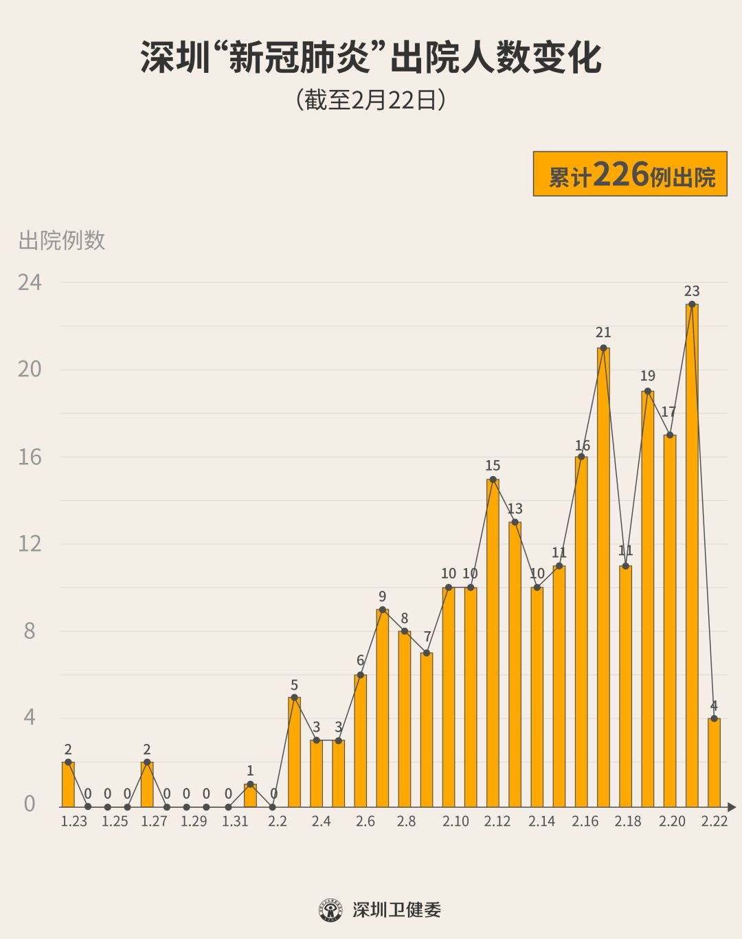2月22日下午,經專家組會診,深圳再有4名新型冠狀病毒肺炎確診患者出院,累計達226人,連續(xù)20天有人出院。