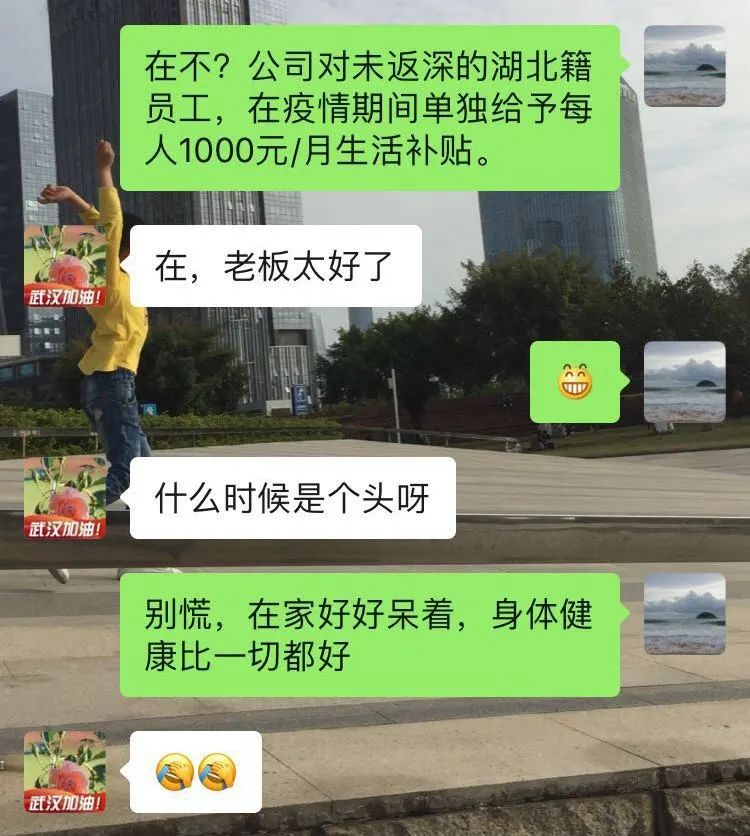“工資已經(jīng)全額到賬,由于疫情影響,針對不能返程的湖北籍員工,每人額外發(fā)放1000元生活補(bǔ)貼?!?月17日,身在湖北公安的晏君收到公司通知后,懸著的心終于放了下來。晏君是深圳坤弘印務(wù)有限公司倉儲部記賬員,她坦言,公司發(fā)放的工資和生活補(bǔ)助是“雪中送炭”,過去近一個月心里確實很忐忑,既擔(dān)心沒工資發(fā),又害怕丟了工作,如今不用擔(dān)心經(jīng)濟(jì)來源了。“關(guān)鍵時候,公司不僅沒有拋棄我們,還給我們諸多關(guān)愛。我發(fā)現(xiàn)我更愛公司、更愛我的工作了。”